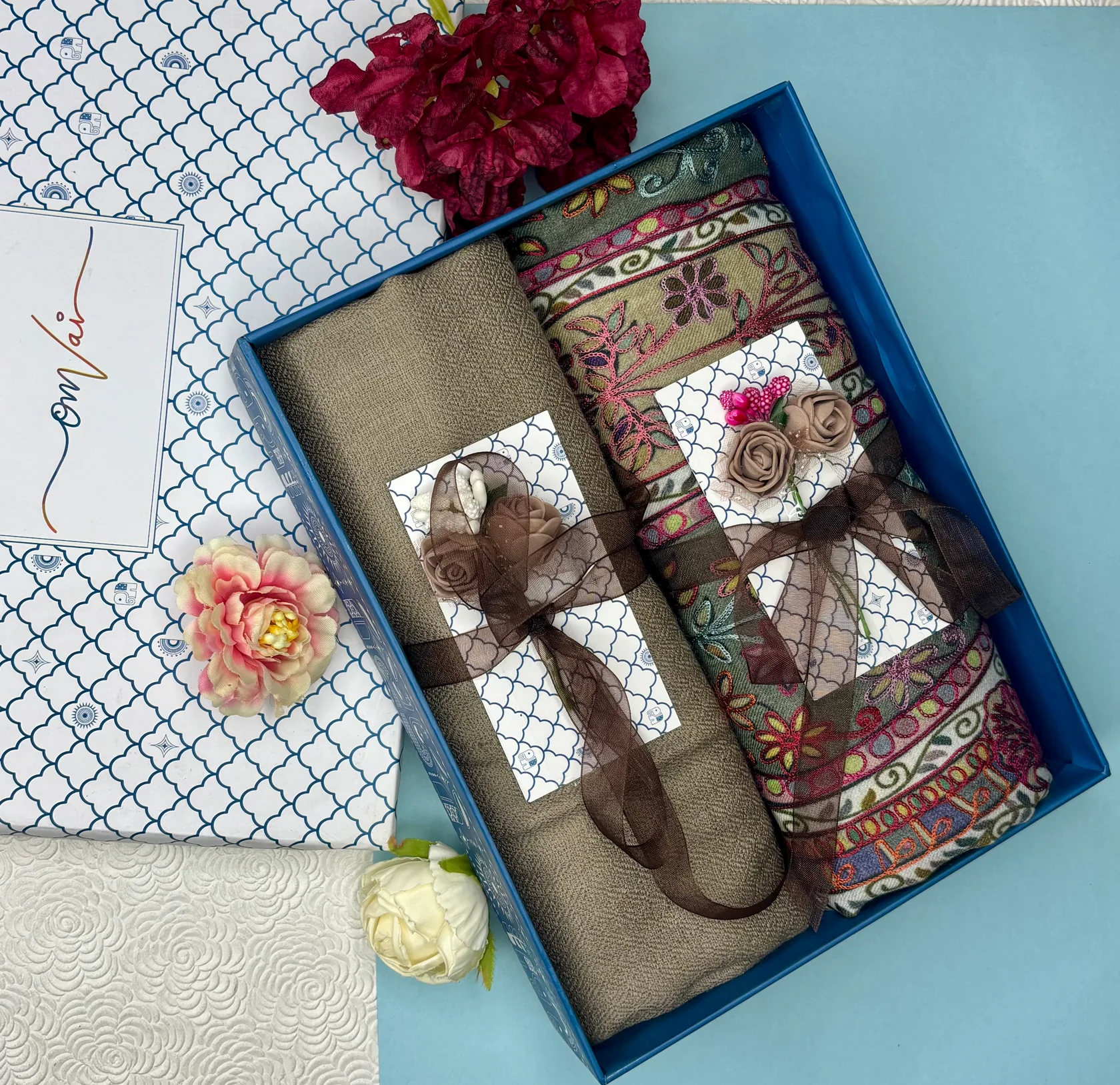 The solid pashmina is paired with a Kalamkari Kani with Machine Aari Embroidery stole which is a woven array of colors. It is pretty and a replica of the Kani shawls which are intricately woven. and hand painted.